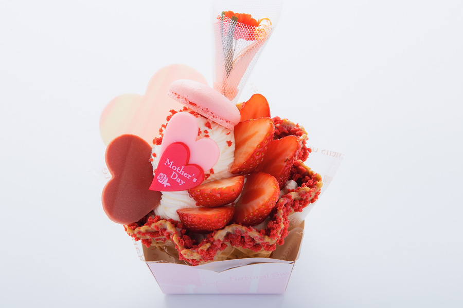 チョコレートコーティングされたワッフルに苺クリームとラズベリーの果肉入りロールとたっぷりの生クリーム。さらにカスタードクリーム ・苺・マカロンなどで華やかに飾りつけしました。