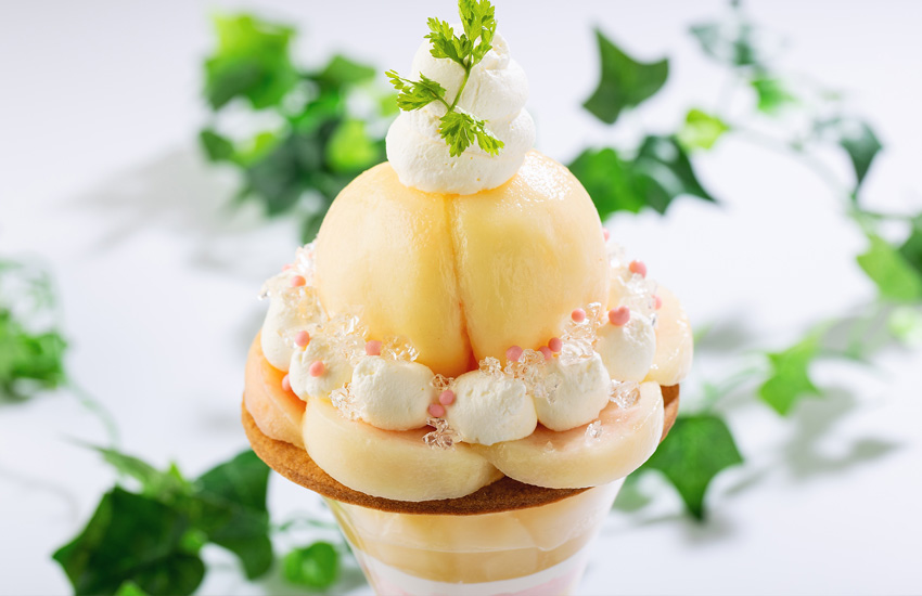 PBカフェイートインメニュー パティシエ渾身まるごとピーチ桃パフェ 1500円 1日10食限定